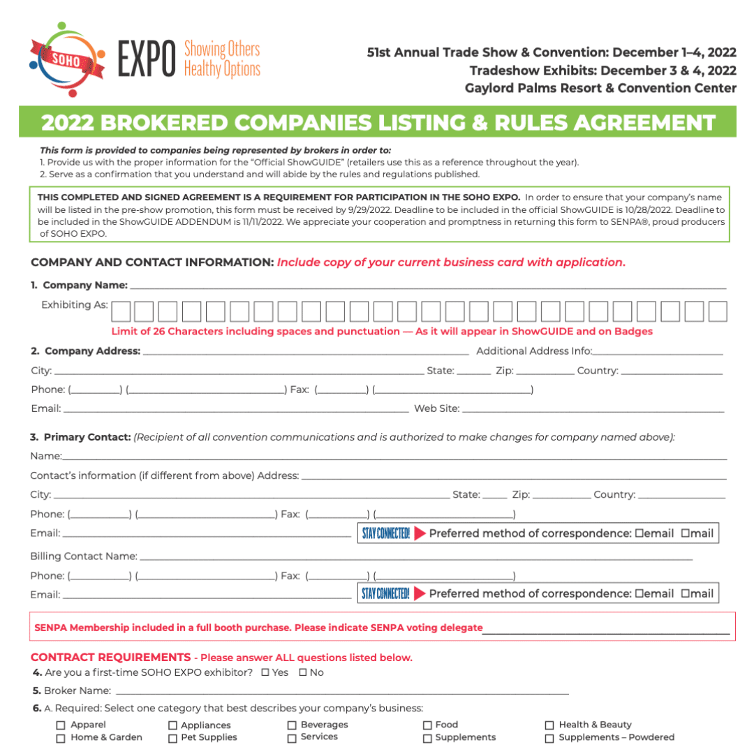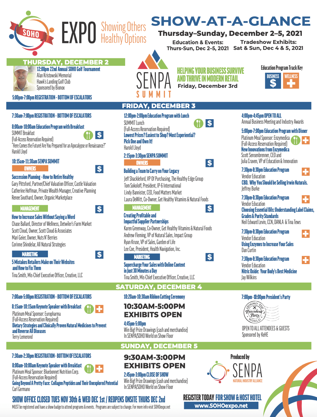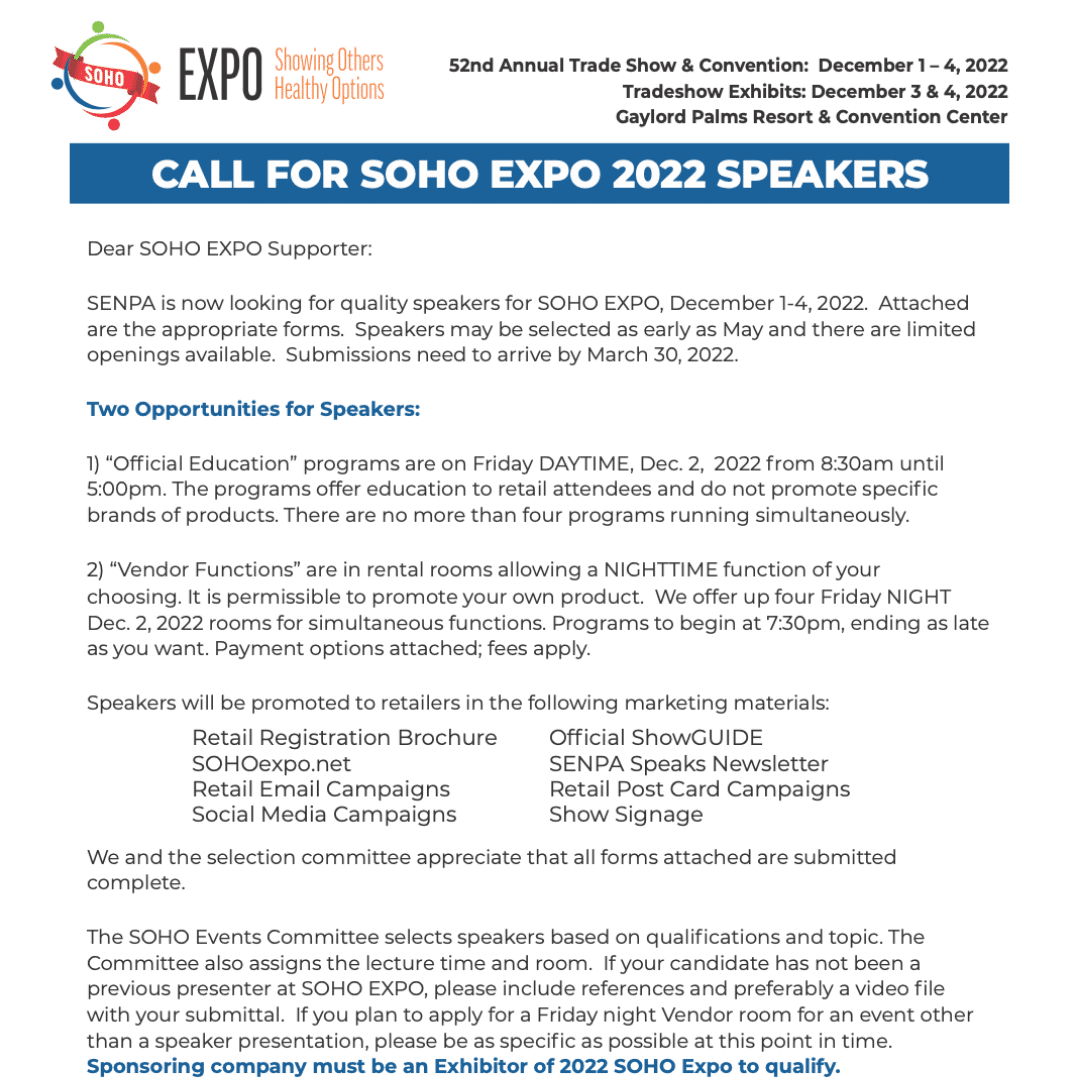 SOHO EXPO (Dec. 1-4, 2022) is a Natural Products Industry Trade Show and Convention produced since 1971 by SENPA a non-profit Trade Association with proceeds from the show staying within the industry. SOHO EXPO offers the right mix of the natural products industry, and is located at the beautiful Gaylord Palms Resort and Convention Center in Orlando, FL.